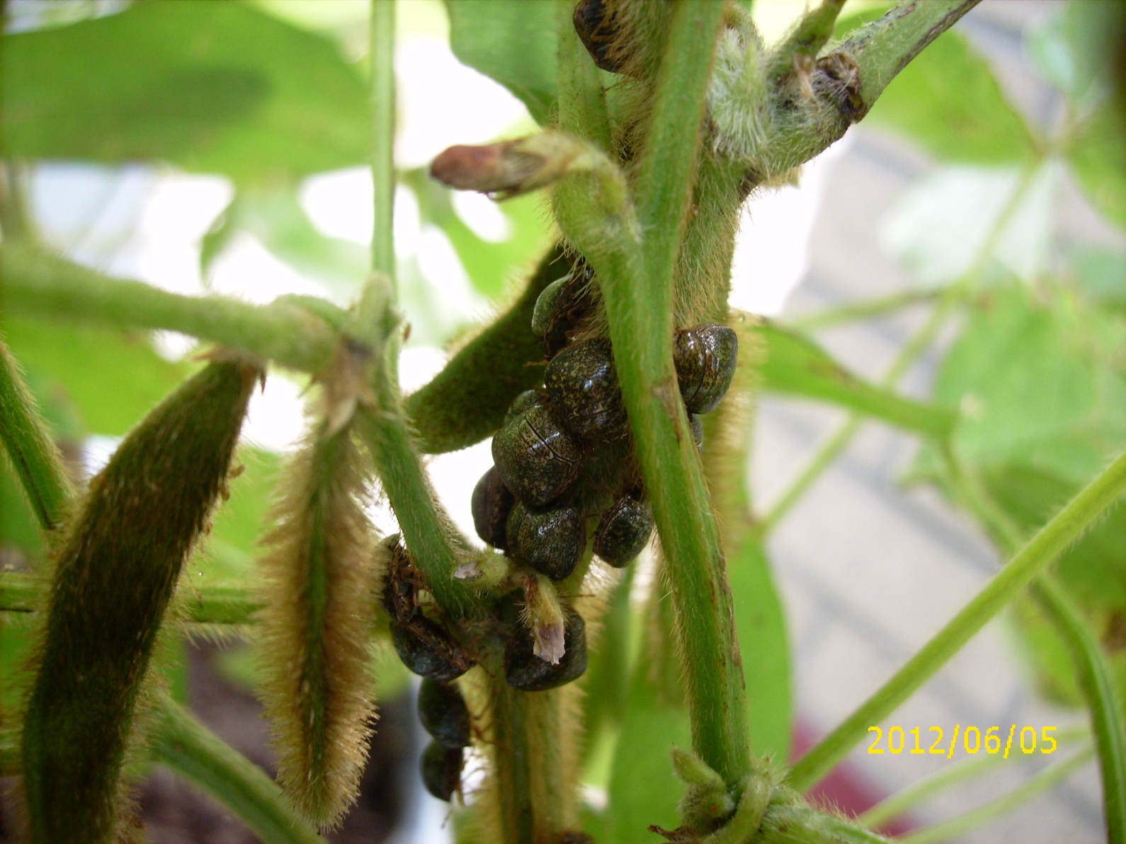 On soybeans, the kudzu bug adults and nymphs feed on vascular fluids at the stem, petiole, and nodes (last instar nymphs with purplish wing pads), while small nymphs have been observed feeding on leaf veins. Yield losses can be very high if left untreated over time (up to 60%), but consultants and growers should not be alarmed by large numbers over short time periods.