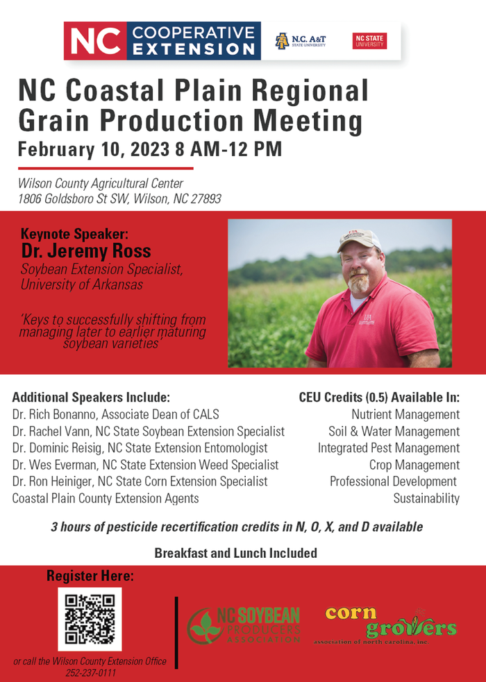 Join us for the Coastal Plain Regional Grain Production Meeting on February 10th at the Wilson County Agricultural Center featuring keynote speaker Dr. Jeremy Ross, Soybean Specialist at the University of Arkansas, who will discuss keys to shifting from producing later maturing to earlier maturing varieties. Register Online with Google or by calling 252-237-0111.